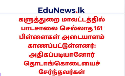 களுத்துறை மாவட்டத்தில் 2025 ஆம் ஆண்டிற்காக பாடசாலைக்குச் செல்லாத வயதுடைய 161 சிறுவர்கள் அடையாளம் காணப்பட்டுள்ளனர். இவர்களில் அதிகப்படியான சிறுவர்கள் தொடாங்கொடை பிரதேச செயலகப் பிரிவில் பதிவாகியுள்ளதாகத் தெரிவிக்கப்பட்டுள்ளது.
