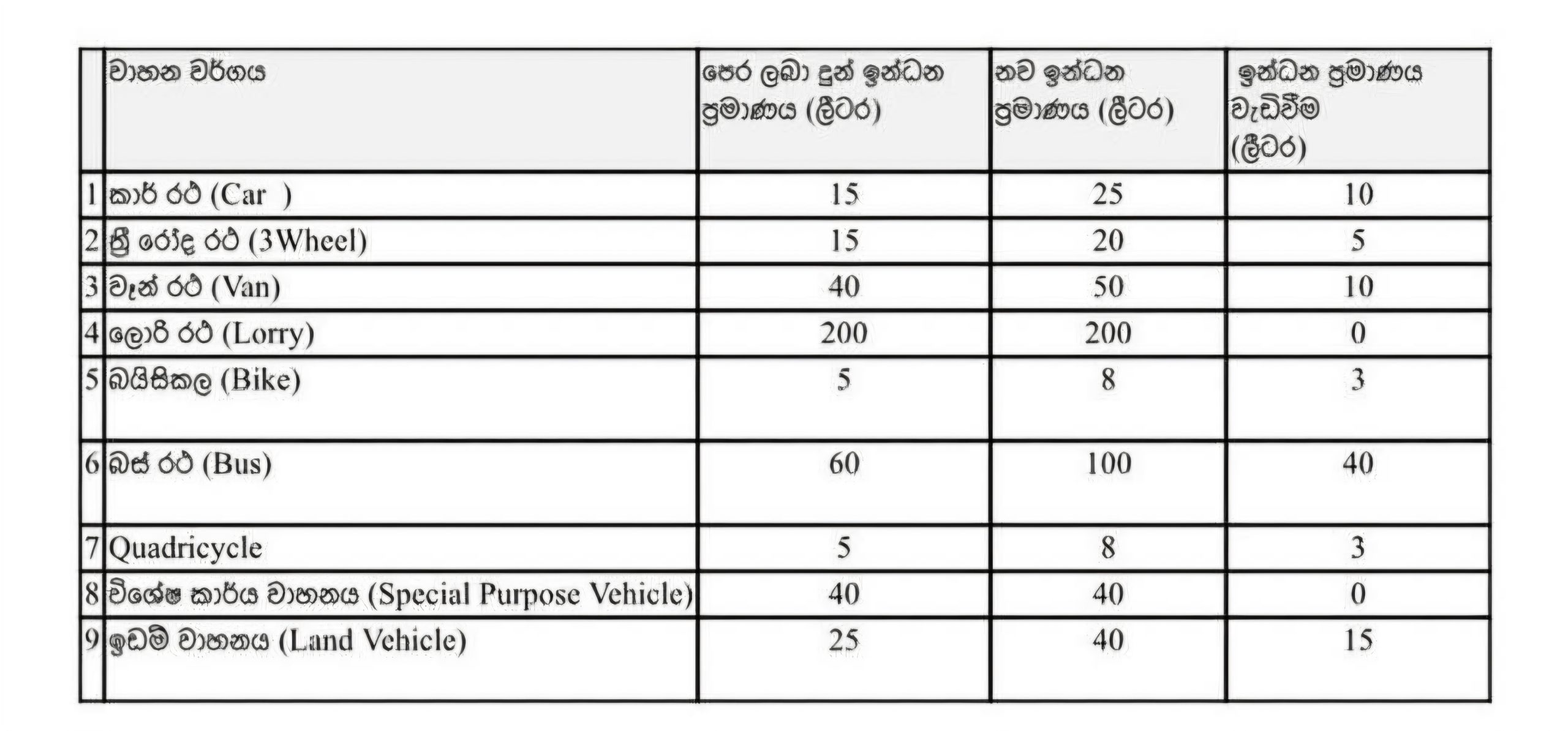 • எவ்வாறாயினும், பின்வரும் வாகன வகைகளுக்கான எரிபொருள் ஒதுக்கீட்டில் எவ்வித மாற்றமும் செய்யப்படவில்லை என இலங்கை கனிப்பொருள் எண்ணெய் கூட்டுத்தாபனம் மேலும் அறிவித்துள்ளது: