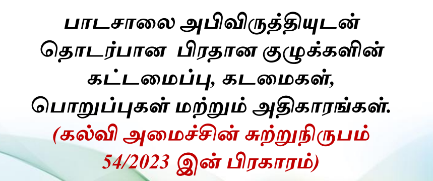 பாடசாலைகளின் முறையான நிர்வாகம் மற்றும் அபிவிருத்திக்குத் தேவையான பல்வேறு குழுக்களின் கட்டமைப்பு, அதிகாரங்கள் மற்றும் பொறுப்புகள் குறித்த விரிவான விளக்கங்களை இந்த ஆவணம் வழங்குகிறது. கல்வி அமைச்சின் 54/2023 இலக்கச் சுற்றுநிருபத்தின் வழிகாட்டல்களுக்கு அமைய இது தொகுக்கப்பட்டுள்ளது.