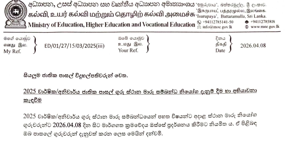 கல்வி, உயர்கல்வி மற்றும் தொழிற்கல்வி அமைச்சானது 2025 ஆம் ஆண்டிற்கான வருடாந்த/கட்டாய தேசிய பாடசாலை ஆசிரியர் இடமாற்ற உத்தரவுகளை உத்தியோகபூர்வமாக வெளியிட்டுள்ளது. இந்த இடமாற்ற உத்தரவுகளை 2026.04.08 முதல் இணையவழியில் பார்வையிட முடியும்.